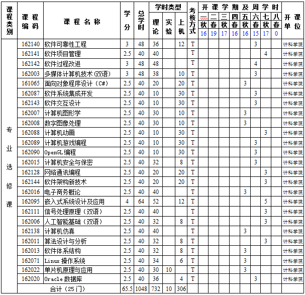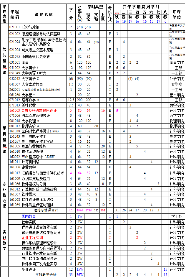 主要课程:马克思主义基本原理、大学英语、高等数学、程序设计基础、离散数学、算法与数据结构、面向对象程序设计(JAVA)、操作系统原理、计算机组成与体系结构、数据库原理及应用、软件需求、软件建模与分析、软件设计与体系结构、软件质量保证与测试。