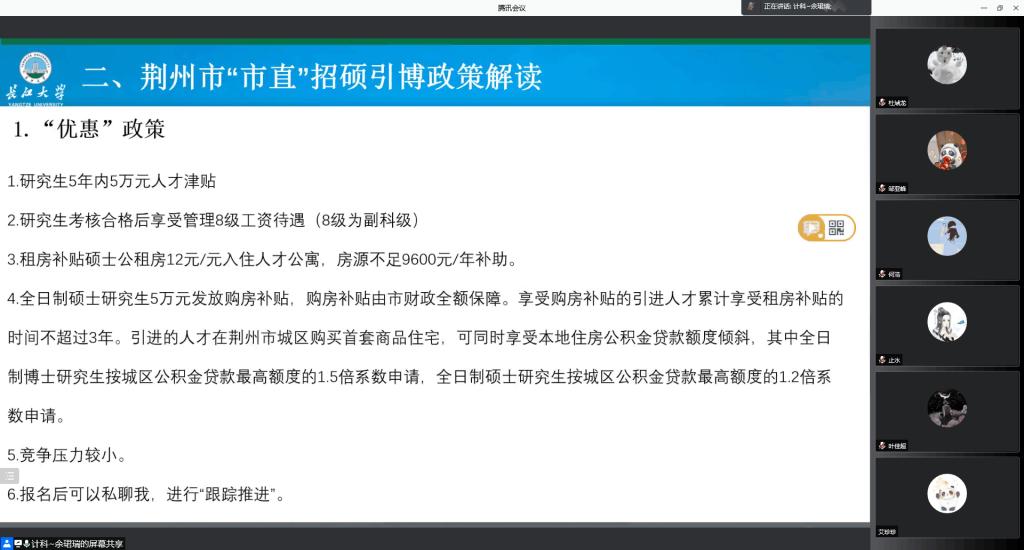 于2月25日晚上7点在腾讯会议上召开19级研究生荆州市“招硕引博”政策解读及春招动员活动。本次会议由就业辅导员余珺瑞老师主持,大福online