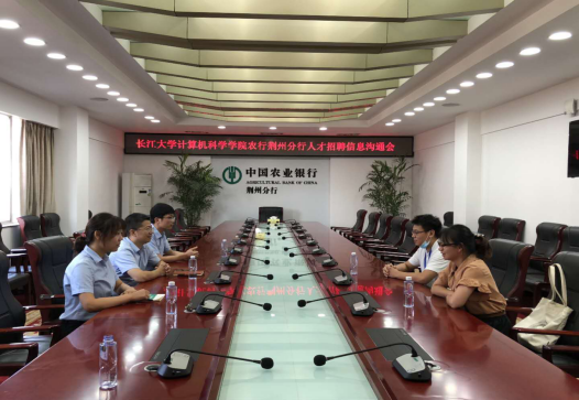 人才招聘信息沟通会在农业银行荆州分行办公室成功举行。此次招聘主要面向计算机及相关专业的2021届应届毕业本科生、研究生。参与此次会议的有农业银行荆州分行信息技术管理部总经理胡刚、高级专员刘自成、产品经理张之涵,长江大学计算机科学学院就业专干余珺瑞、应届毕业研究生丁程程。