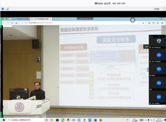 以班级为单位组织观看教育部组织录制的2020年全民国家安全教育日高校公开课和省委国安办联合省广电台以维护人民安全为主题,录制的《生物安全与公共卫生安全专家访谈》视频。另一方面,班级收集了很多关于国家安全的有关资料,开展大讨论,并进行了国家安全知识在线问答。