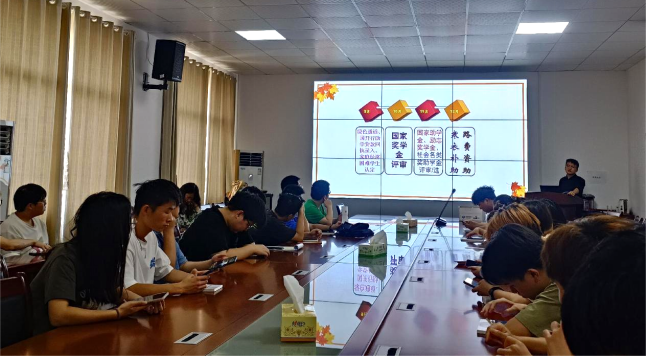 开展中的各项奖助学金工作。其中,重点介绍了国开行助学贷款。他强调,如果贷款申请者能够顺利毕业,就要及时还清助学贷款,一直拖延还款,将会影响个人征信。接着,张颖旭老师依照时间顺序介绍了下个学年即将开展的各项资助工作,分别有:九月的绿色通道、国开行助学贷款回执录入、家庭经济困难学生认定,十月的国家奖学金评审,十一月的国家助学金、励志奖学金,社会各类奖助学金评审/选,以及十二月的寒衣补助、路费补助。他指出,上述工作是即将开展的重点工作。他督促各位学生干部团结协作,落实资助工作的各项措施,将各项补助真正惠及有需要的同学。