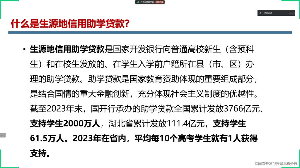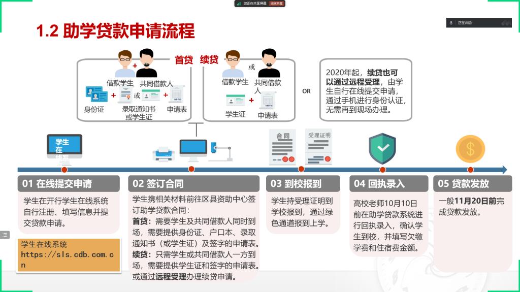 为深入贯彻落实国家资助政策,帮助家庭经济困难学生及家长全面了解生源地信用助学贷款相关事宜,确保家庭经济困难学生能够顺利入学并完成学业,大福online 于9月15日在腾讯会议组织开展了2024-2025学年秋季学期生源地信用助学贷款政策宣讲活动。 活动伊始,大福online 负责资助工作的王鹏翔老师对生源地信用助学贷款政策进行了详细解读。围绕生源地信用助学贷款的申请条件、贷款额度、贷款期限、利息计算、还款方式以及申请流程等关键内容一一展开介绍。用通俗易懂的语言和生动具体的案例,深入浅出地为同学们答疑解惑,确保每一位在场同学都能清晰准确地理解政策细节。 除了对政策的宣讲与答疑,王鹏翔老师在活动中着重强调了资助育人的重要意义。指出生源地信用助学贷款不仅仅是一项经济援助政策,更是国家助力寒门学子实现梦想、成长成才的有力举措,希望同学们能够心怀感恩之心,珍惜来之不易的学习机会,在今后的学习生活中勤奋努力、积极进取,以优异的成绩回报国家和社会的关爱,将来也能够将这份爱心传递下去,去帮助更多有需要的人,真正将资助化作成长路上的动力,努力肩负起时代赋予的责任与使命。 此次生源地信用助学贷款政策宣讲活动,是大福online 2024-2025学年秋季学期资助育人工作的重要一环,通过活动的开展,进一步加大了国家资助政策的宣传力度,使更多学生受益于生源地信用助学贷款政策,同时也在学生心中种下了感恩与担当的种子,为大福online 后续资助育人工作的深入推进奠定了坚实基础。