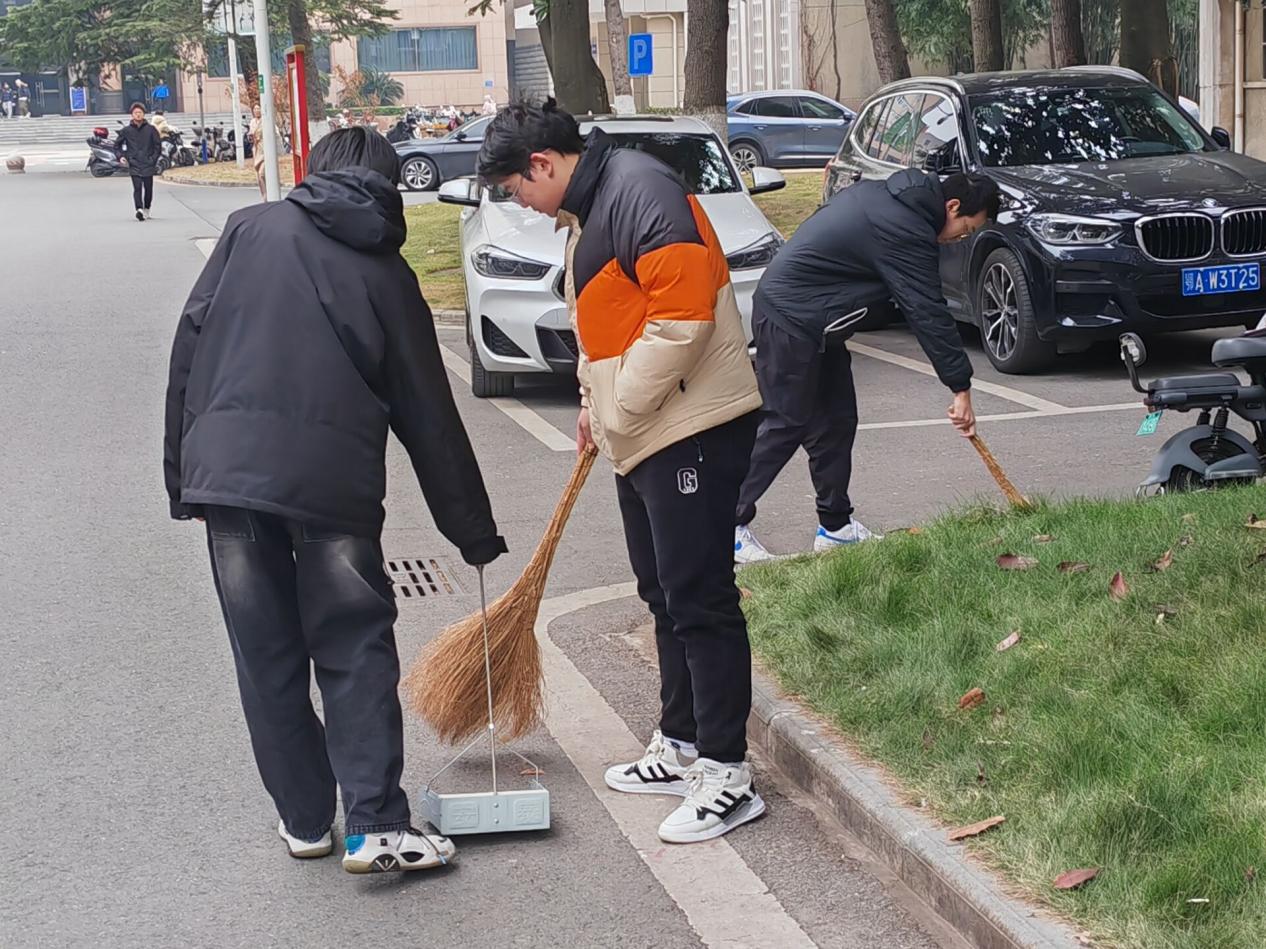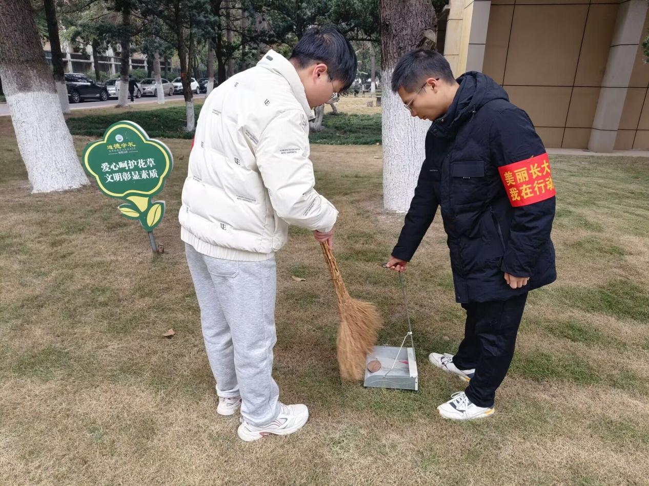 活动负责人合理分配各项劳动任务,叮嘱相关注意事项,学生们各司其职,有序对校园进行细致全面的清洁。