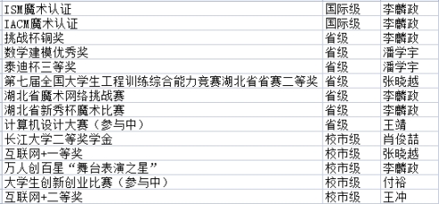 安排的各项任务。 一个集体就是一个家,同学们来自大江南北,有着不同的口音,有着不同的习惯,汇聚于此,一切又是那么默契,那么自然,班里每个同学都十分配合学校的各项大小事务,认真做好每一件事,争创文明寝室、和谐班级。 以下是我们班同学在这一学年取得的获奖情况(部分):