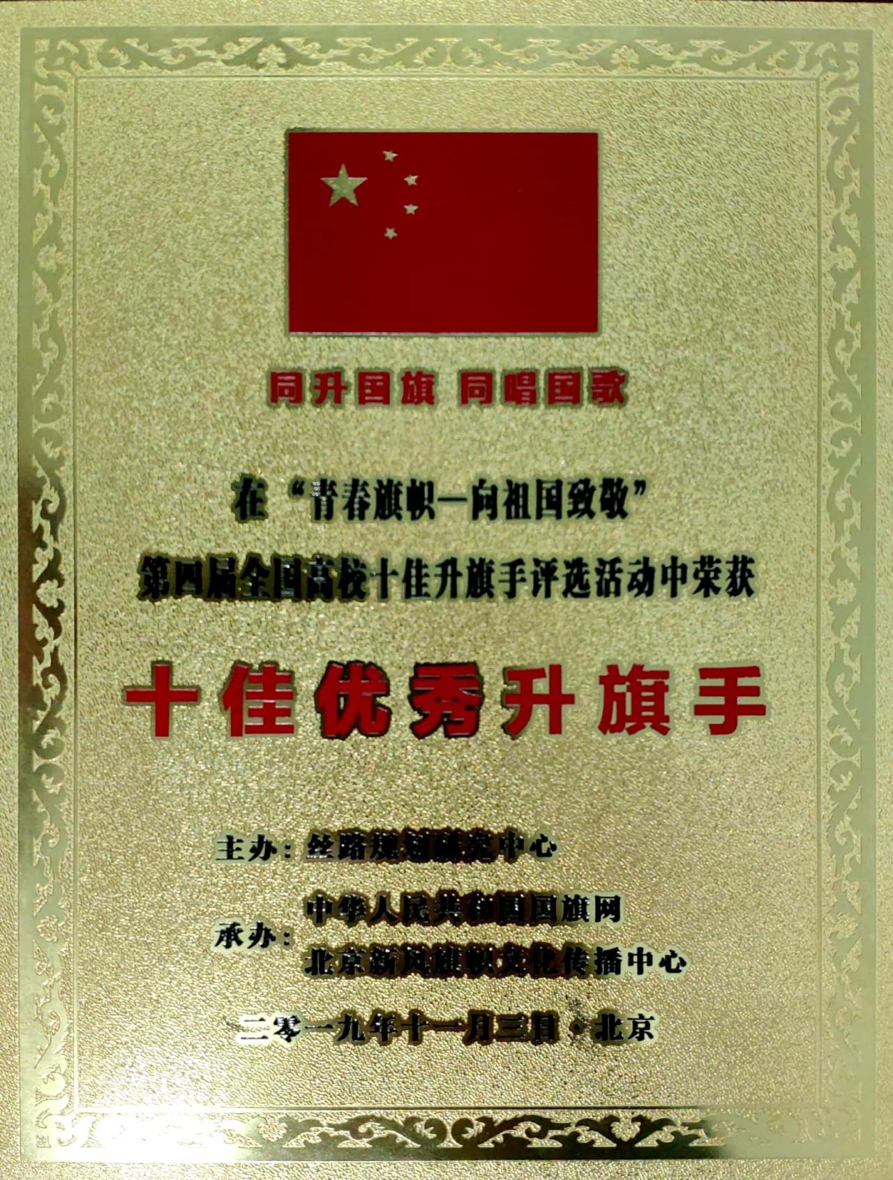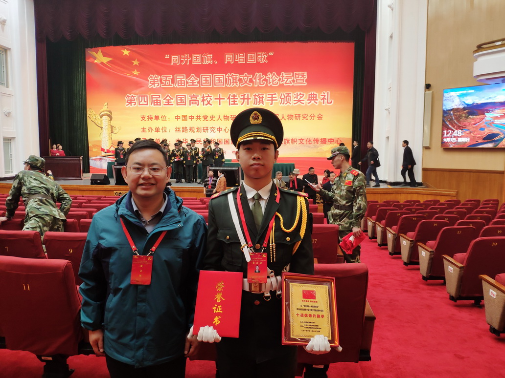 据介绍,此次活动是由丝路规划研究中心主办,中华人民共和国国旗网、中国旗帜学研究中心、北京新风旗帜文化传播中心承办,以传承红色基因,厚植爱国情怀为宗旨,推动学校国旗文化进一步普及规范为目的。本次活动由“同升国旗、同唱国歌”第六届全国学校升旗手交流展示和“青春旗帜•向祖国致敬”第四届全国高校十佳升旗手评选活动两个部分组成。刘明圣同学在知识竞赛、演讲比赛、升旗手动作比赛等多项评比过程中表现优异,成绩突出,他对国旗文化的了解,升旗动作的规范,坚忍不拔的毅力,获得了在场评委的一致称赞。