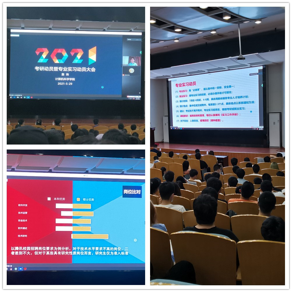 分管教学工作的副院长詹炜做实习、考研动员。詹院长首先结合当下形势,对计算机大类专业毕业求职优势和国家对于创新性人才的需求进行了分析,鼓励大三学生认清形势后结合自身的情况去思考如何抉择就业和考研。同时结合近五年来全国研究生报考人数的情况和往年大福online官网