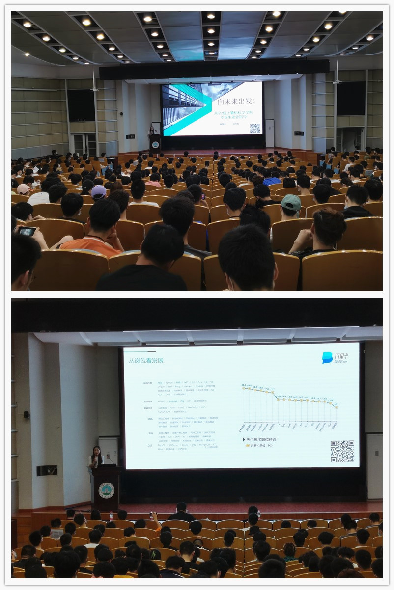会议第三项,企业代表百里半公司高级人力资源管理师段俊红经理做就业指导报告。主要从IT行业发展现状及未来趋势、企业招聘需求分析、面试小技巧等三个部分带领在座同学,从企业的角度出发,帮助学生思考如何从岗位看发展、从薪酬分析看发展,帮助学生了解企业青睐毕业生的特质关键词,让在座的同学们更好地了解了企业招聘与学生应聘之间的要素和要点。