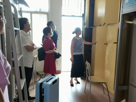 院长崔艳荣、党委书记黄群俊、党委副书记颜学俊与辅导员张颖旭一起走访了学生寝室,与学生亲切交流。