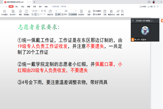 为志愿者统一配备了工作证和志愿者帽,新生辅导员张颖旭对志愿者进行了线上线下培训,培训会上,张老师就志愿者排班、着装、职责及安全事项等方面作出明确要求。