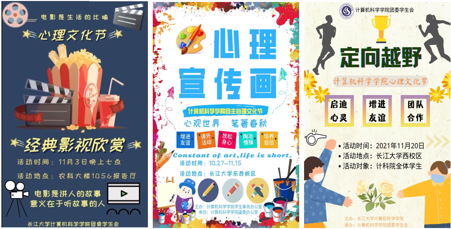 第六届心理文化节。此次文化节由三个子活动组成,分别是:沉浸心灵之旅——观影活动、共筑“心”青春——心理宣传画活动、智慧启迪心灵——定向越野活动。