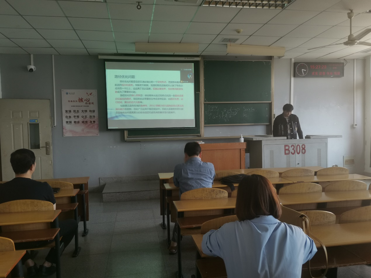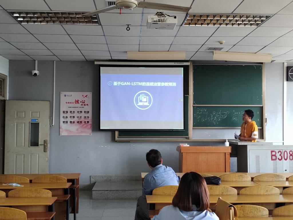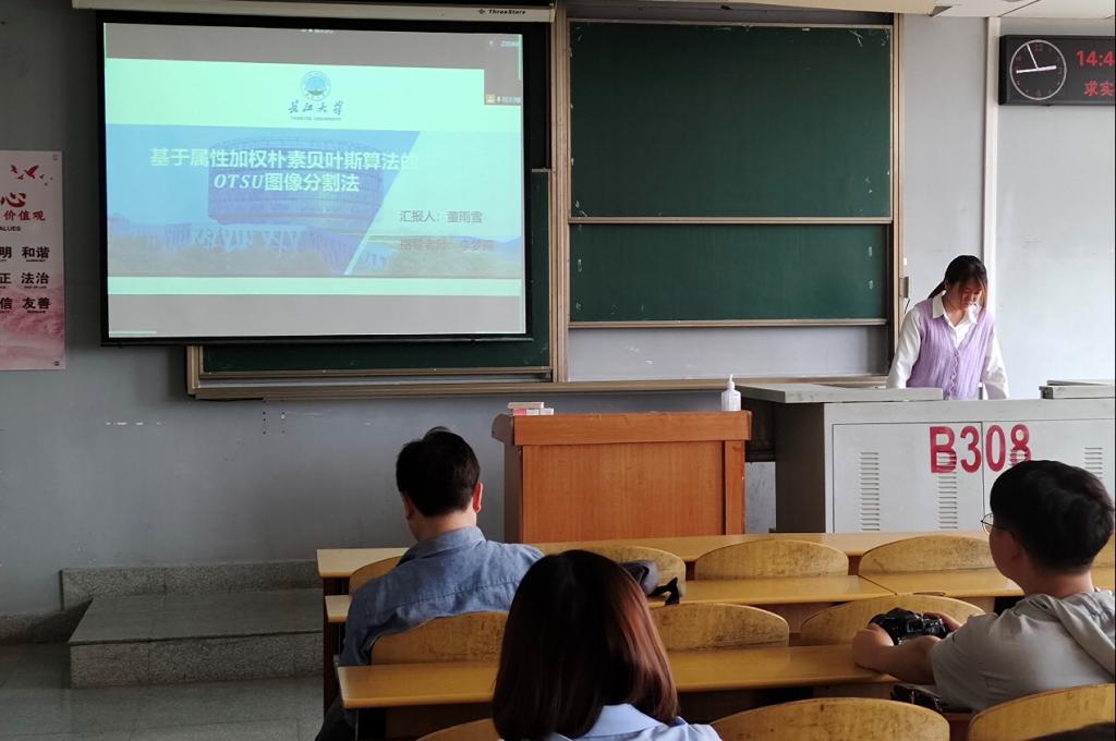 9位研究生依次登台演讲,分别围绕各自的研究方向,为同学们分享了9个课题:基于属性加权朴素贝叶斯算法的OTSU图像分割方法,基于深度学习的无监督红外图像与可见光图像融合算法,深度Q学习-DQN算法原理,基于Bp神经网络的乳腺癌候选药选择,改进蚁群算法在路径优化中的应用,基于GAN~LSTM的连续管振动分析,基于传统双目立体视觉的车辆测距和目标识别研究,基于卷积神经网络的DSA脑血管分割算法研究,时序结构下工人动作预测的方法研究等内容。学术论文报告会已经成为同学们知识共享和传播的一种重要方式,在演讲过程中,导师与听众和演讲人针对相关研究成果互动、探讨。每名研究生演讲完后,四位导师从多角度对演讲学生的汇报进行仔细点评,对其研究内容可能遇到的科研困难进行指导,通过点评有效促进了研究生的成长。