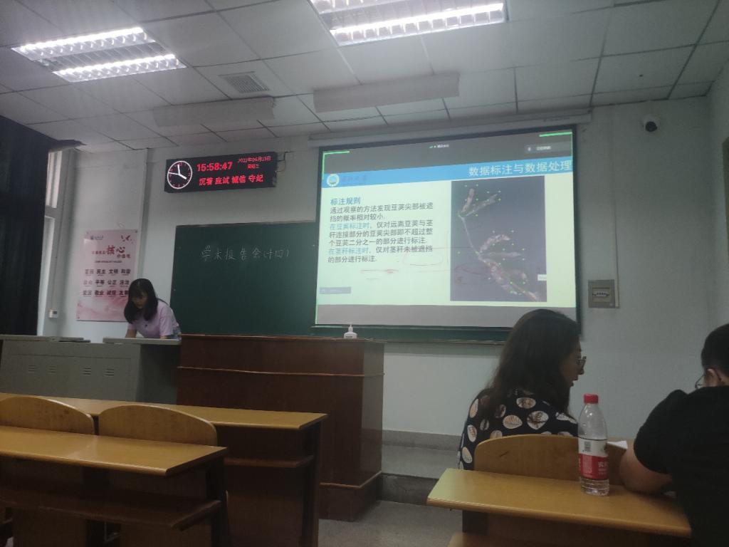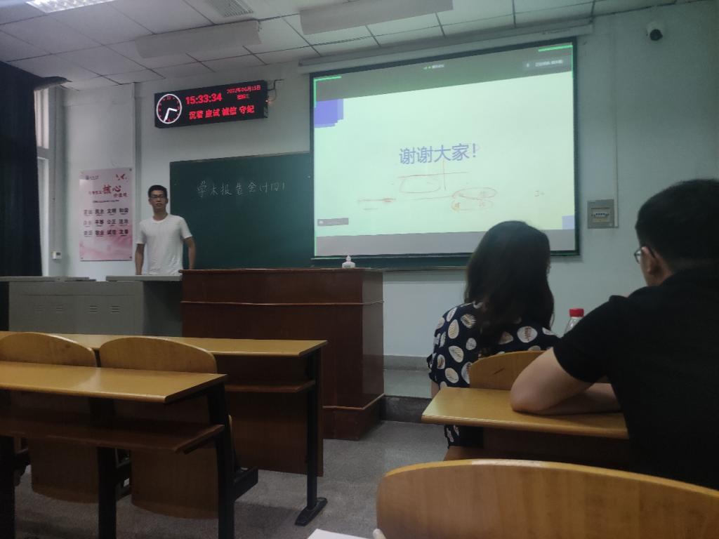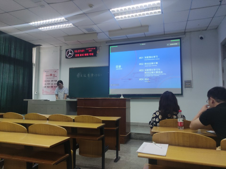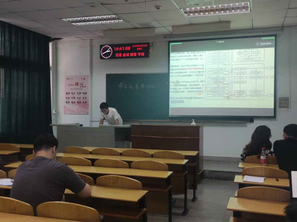 9位研究生依次登台演讲,分别围绕各自的研究方向,为同学们分享了9个课题:硬盘诊断技术研究、基于VQ-Diffusion的文本到图像合成、基于YOLOv5的目标检测研究、基于YOLOv5和DeepSort的目标识别及追踪、基于MapReduce的股票数据聚类分析、图卷积神经网络及应用、深度强化学习在移动边缘计算的任务卸载研究、基于知识图谱的问答系统、基于YOLOv5的大豆豆荚和茎秆的识别等内容。学术论文报告会已经成为同学们知识共享和传播的一种重要方式,在演讲过程中,两位导师与听众和演讲人针对相关研究成果互动、探讨。每名研究生演讲完后,两位导师都从更加深入的角度对演讲学生的汇报进行仔细点评,对其研究内容的下一步行动进行了探究,通过点评有效促进了研究生的成长。