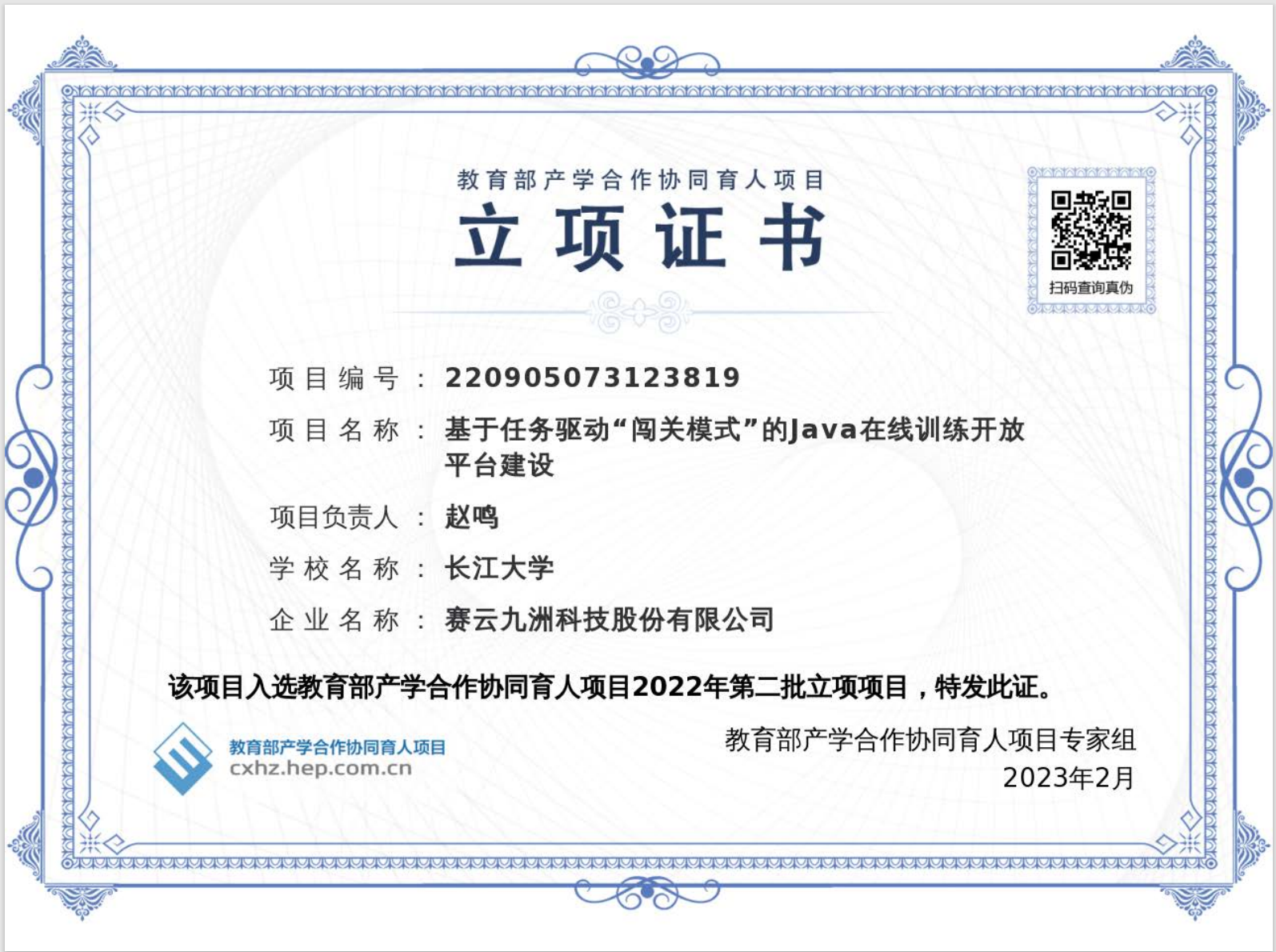 赵鸣老师的《基于任务驱动“闯关模式“的Java在线训练开放平台建设》入选教育部产学合作协同育人2022年第二批立项项目。