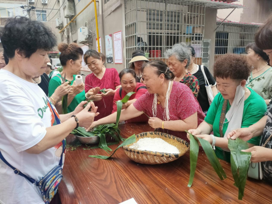 活动当天,志愿者早早地来到社区,协助社区工作人员将活动所需的桌椅板凳摆放好,并张贴好主题横幅。活动伊始,由志愿者客串的主持人为大家介绍了传统节日端午节的由来和典故以及端午节期间的民风习俗。接下来,志愿者进行了诗歌朗诵表演,歌颂中华传统节日。随后,活动现场进行了端午节民俗知识竞答,进一步加深居民对传统文化的深刻理解和认识。社区的居民们十分热情,积极参与竞答,热闹非凡。紧接着,在志愿者的细心协助下,居民们开始编织五彩绳,寓意驱疾病、驱厄运、保平安,编织完后大家拿着自己亲手做的五彩绳爱不释手。最后,活动的重头戏登场——包粽子。在社区娴熟老人的带领下,居民填米,裹粽,绑线一气呵成,一个个精美的粽子就包好了。现学现卖的志愿者也跃跃欲试,填米,裹粽,露馅,惹得大家哈哈大笑,老师傅们纷纷“施以援手”,现场一片热闹,其乐融融。