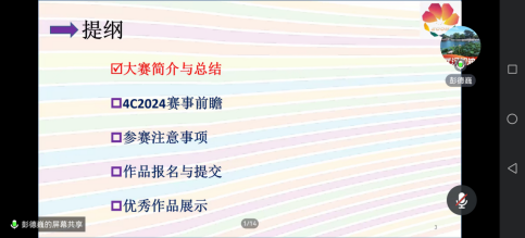 副教授、湖北省人工智能学会理事,主要从事人工智能、移动计算等领域的研究与教学工作。长期担任各类学科竞赛评审专家,具有丰富的大赛指导经验。本次讲座,彭教授主要从大赛简介与总结、4C2024赛事前瞻、参赛注意事项、作品报名与提交、优秀作品展示等五个方面进行了详细讲解。在4C2024赛事前瞻上,彭教授着重强调,今年赛事与往年相比有改动,有些赛道的类别进行了优化。同时,在参赛注意事项上,彭教授从报名比赛的资料填写、参赛过程的素材准备到现场答辩形式,从校赛到省赛再到国赛,事无巨细的给同学们进行了详细的讲解。在会议尾声,彭教授展示出往届许多优秀作品供学生们参考。在最后的答疑环节,针对同学们提出的各项疑问,彭教授也一一做了详细讲解。