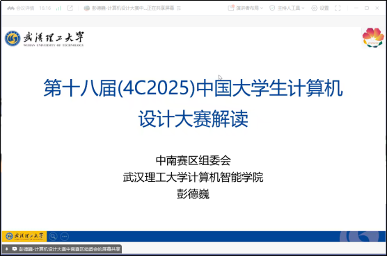 2025年3月26日,武汉理工大学彭德巍副教授在腾讯会议平台上为我校师生做了第十八届中国大学生计算机设计大赛赛事解析和参赛指导。本次会议由大福online