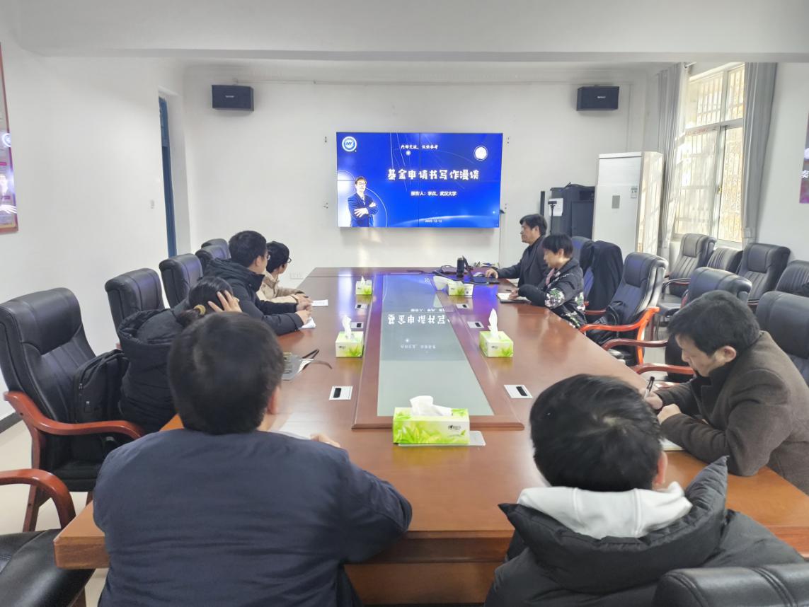 在4教307召开2026年度国家自然科学基金申报推进会。武汉大学二级教授、博士生导师李兵应邀作《基金申请书写作漫谈》专题辅导,院长崔艳荣主持,30余名教师现场聆听。