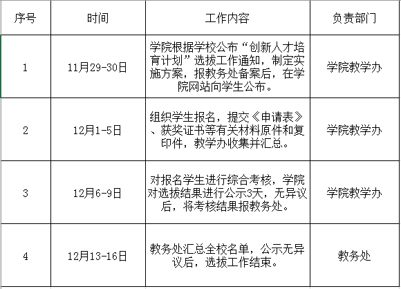 (四)教务处将通过复审的学生名单报学校“创新人才培育计划”工作领导小组审定,并将结果进行公示,如无异议,则确定其为“创新人才培育计划”入选学生。