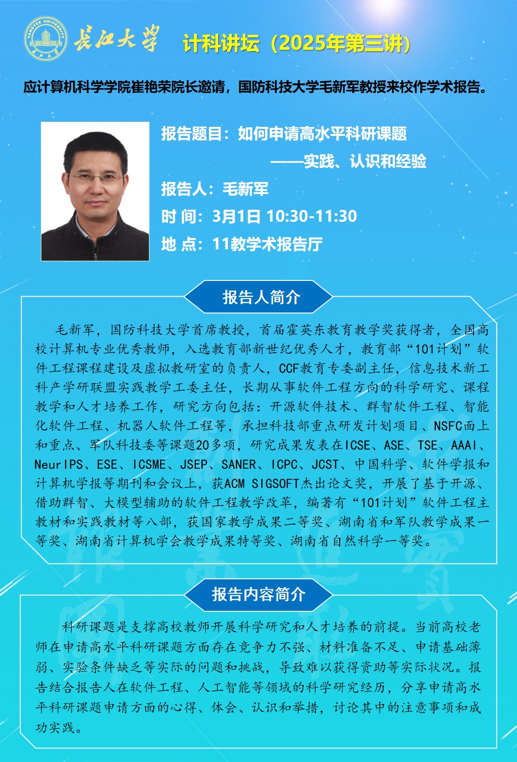 计科讲坛(2025年第三讲):如何申请高水平科研课题——实践、认识和经验