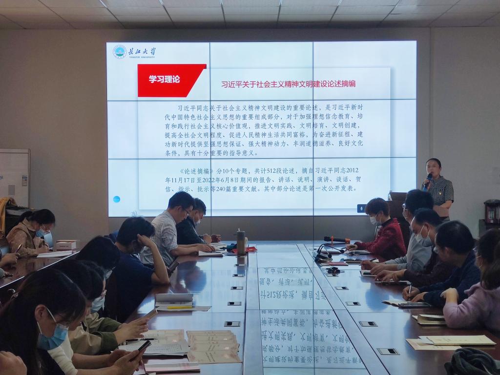 会上,全体教职工还集中学习:习近平总书记在中国共产党第二十次全国代表大会上的报告,中国共产党章程(修正案),十九届中央纪律检查委员会工作报告,习近平总书记在党的二十大闭幕会上的重要讲话精神,中共中央关于认真学习宣传贯彻党的二十大精神的决定,长江大学关于推进师德师风建设的十条举措(试行)等。